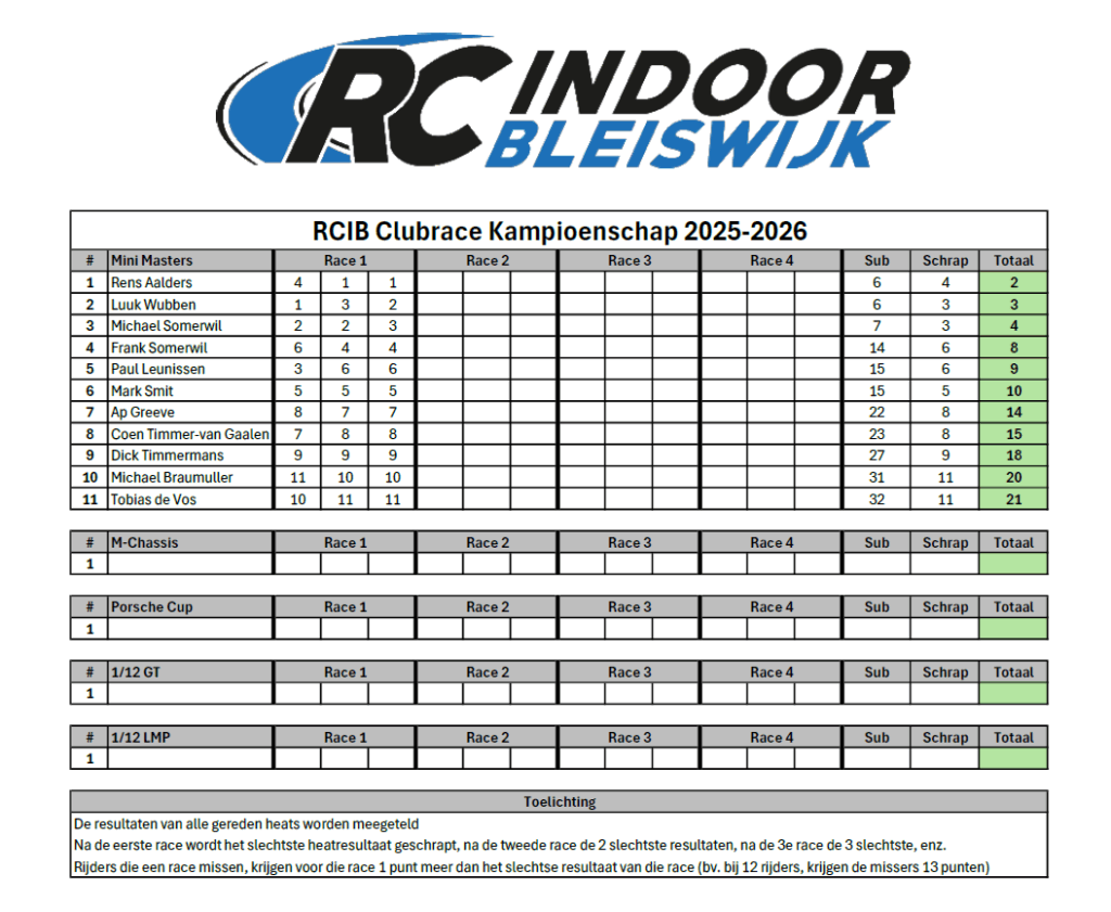 Net als in de Formule 1 kan een rijder per wedstrijd punten behalen. Aan het einde van het seizoen worden de kampioenen benoemd. Hieronder is de actuele stand in het RCIB Clubrace Kampioenschap 2025-2026 weergegeven en te downloaden.